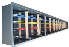 Several types of Tray are used in different applications. A solid bottom tray provides the maximum protection to cables, but requires cutting the tray or using fittings to enter or exit cables. A deep, solid enclosure for cables is called a cable channel or cable trough. A ventilated tray has openings in the bottom of the tray, allowing some air circulation around the cables, water drainage & allowing some dust to fall through the tray. Small cables may exit the tray through the ventilation openings, which may be either slots or holes punched in the bottom. A Ladder tray has the cable supported by a traverse bar, similarly to the rungs of a ladder, at regular intervals on the order of 4 to 12 inches ( 100 to 300 mm) & width of the ladder 100 mm to 1000 mm. Ladder & ventilated trays may have solid covers to protect cables from falling objects, dust & water. Tray covers for use outdoors or in dusty locations may have peaked shape to shed debris including dust, ice or snow. Large power cables laid in the tray may require support blocks to maintain spacing between conductors to prevent overheating of the wires. Smaller cables may be laid unsecured in horizontal trays, or secured with cable ties to the bottom of vertically mounted trays. To maintain support of cables at changes of elevation or direction of a tray, a large number of specialized cable tray fittings are made compatible with each style & manufacturer. Horizontal elbows change direction of a tray in the same plane as the bottom of the tray & are made 30,45 & 90 degrees forms, inside & outside elbows are for changes perpendicular to the tray bottom. These can be in various shapes including tees & crosses. Some adjustable elbows useful for field-fitting a tray around Obstacles or around irregular shapes. Various clamping, supporting & splicing accessories are used with the cable tray to provide a complete functional tray system. For example – Different sizes of cable tray used within one run can be connected with reducers.